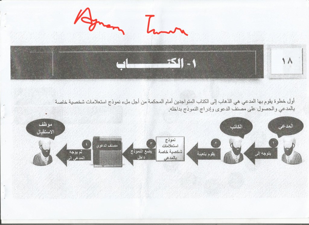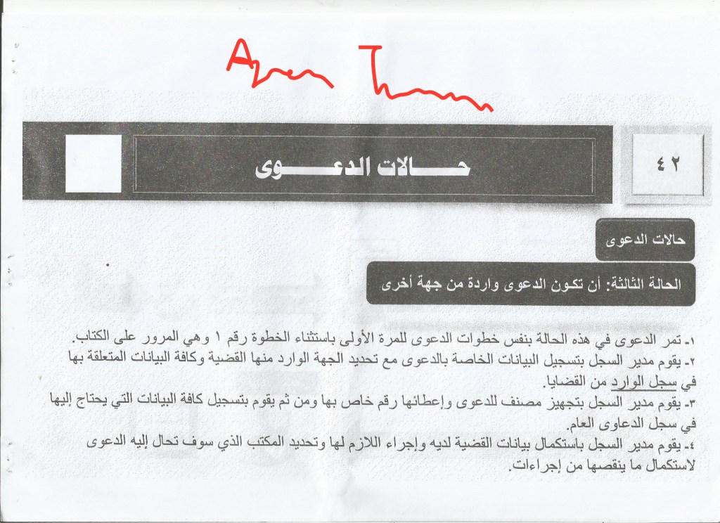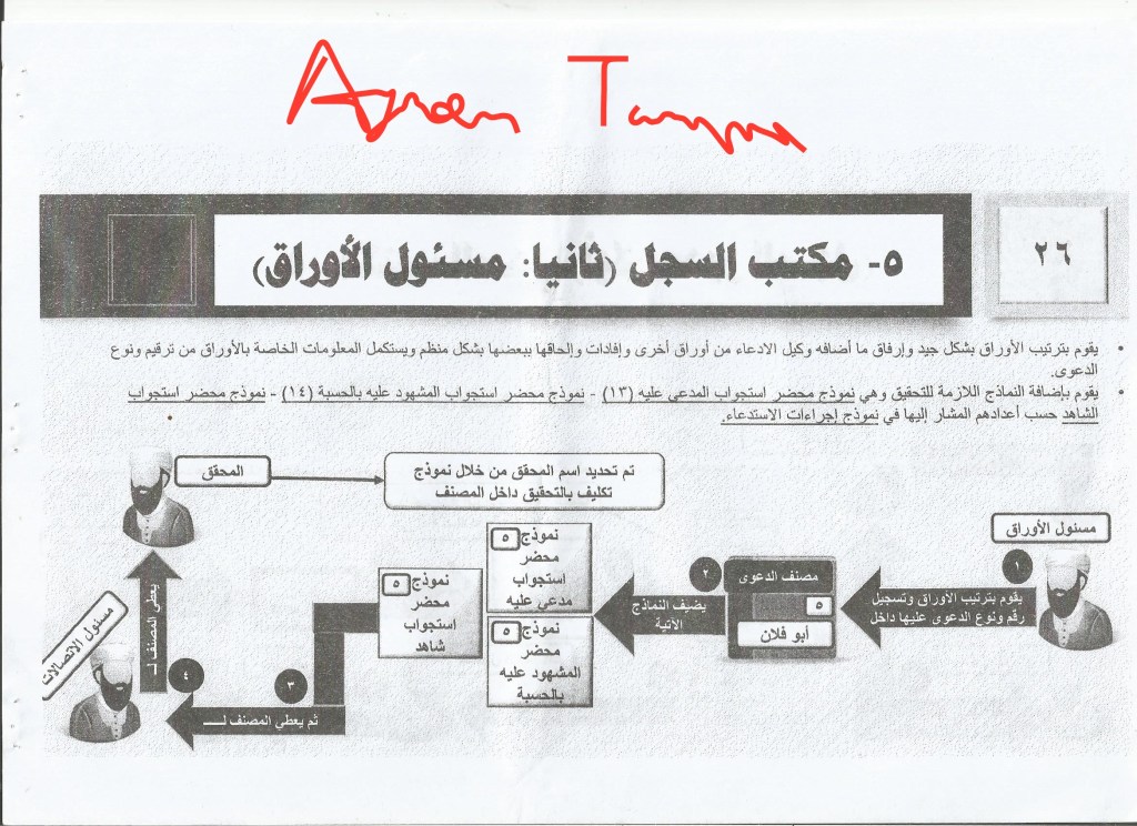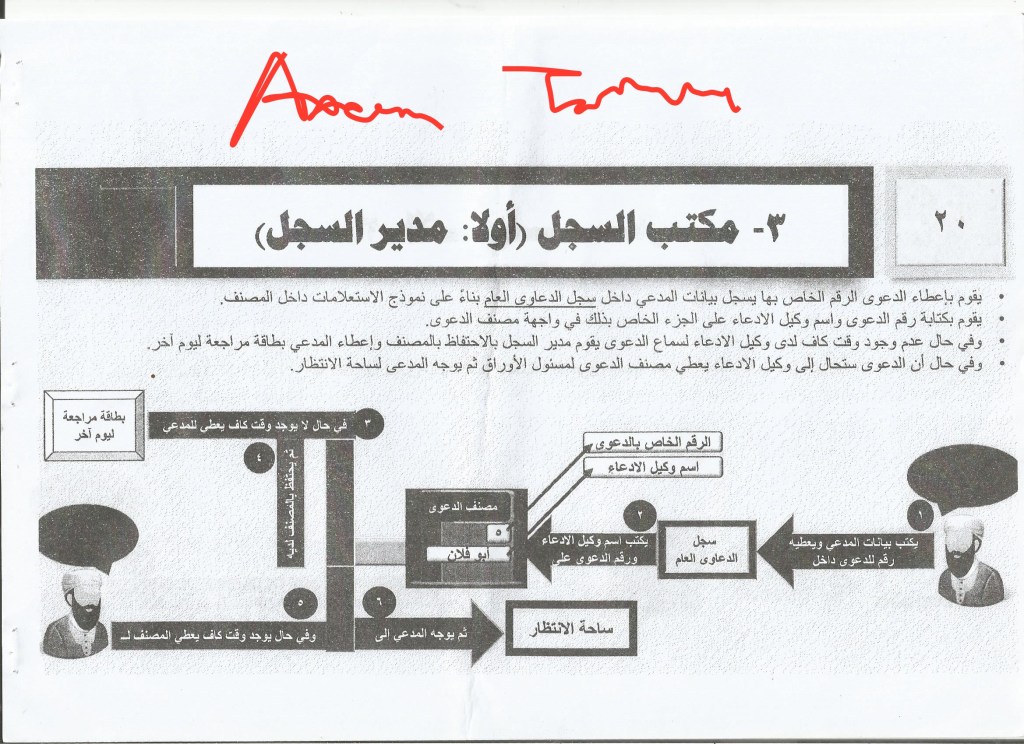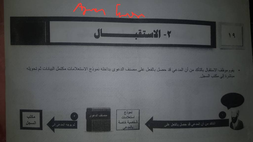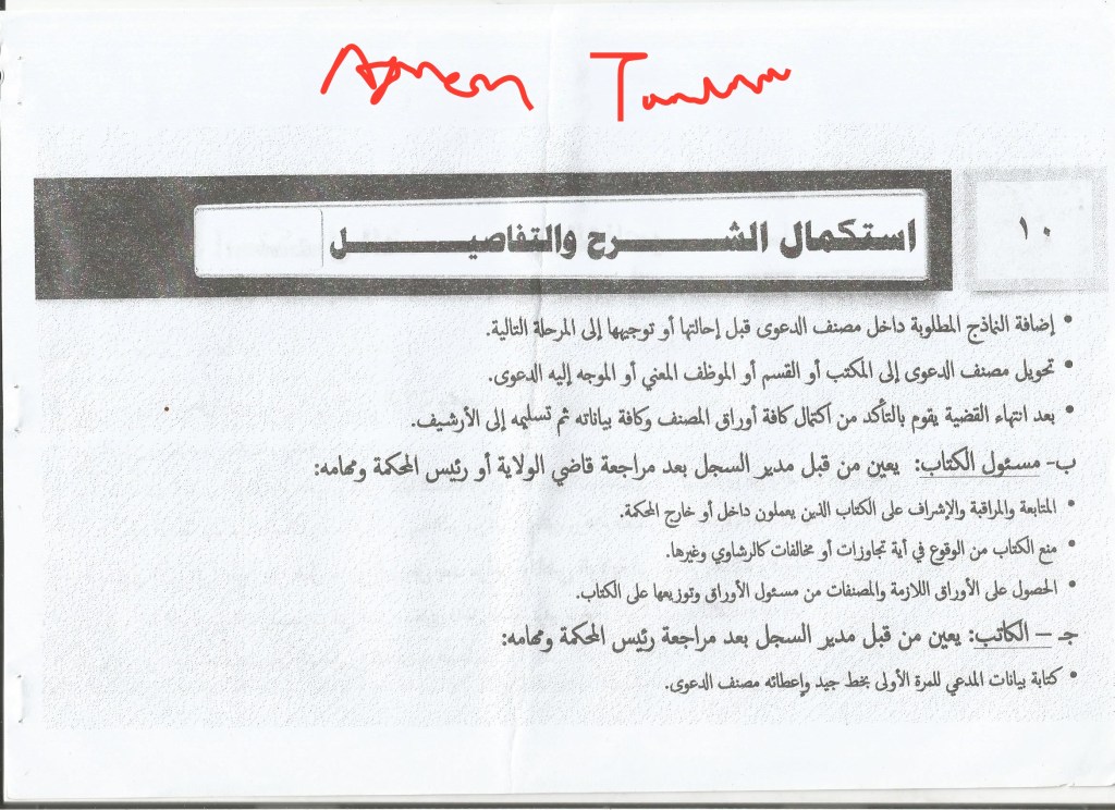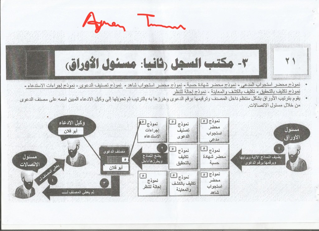 3. Director of the registry, who makes a copy of the case file in the archive after knowing its number and makes a new compilation for it and gives it a number inside the general registry of cases. He then directs the claimant to the waiting square.