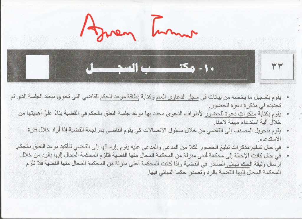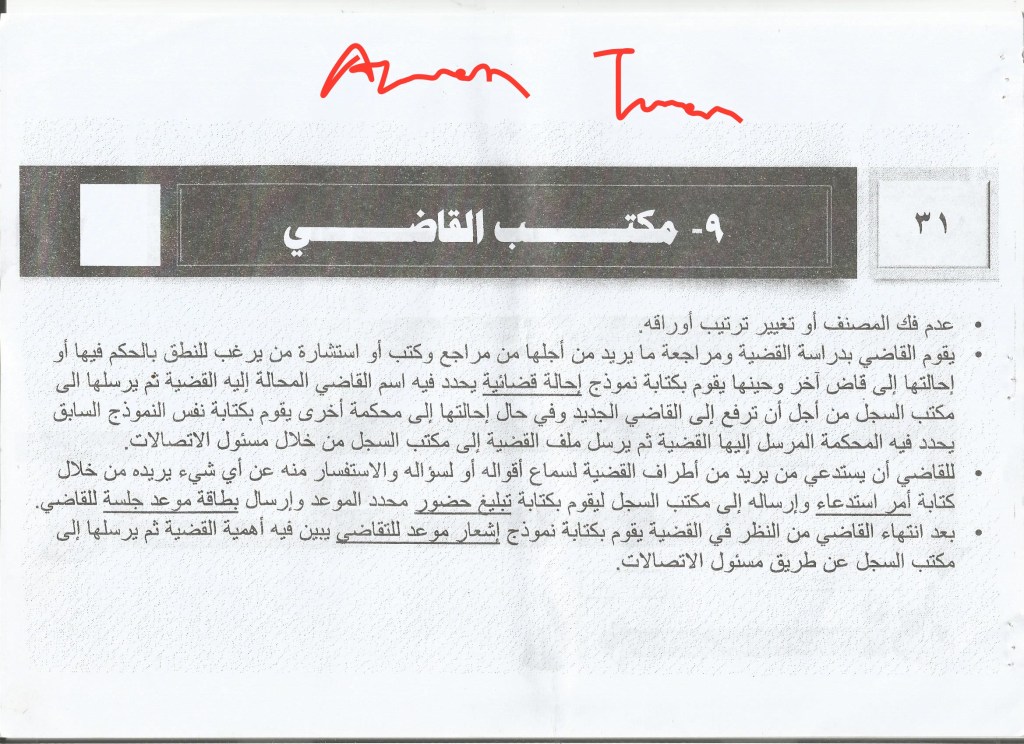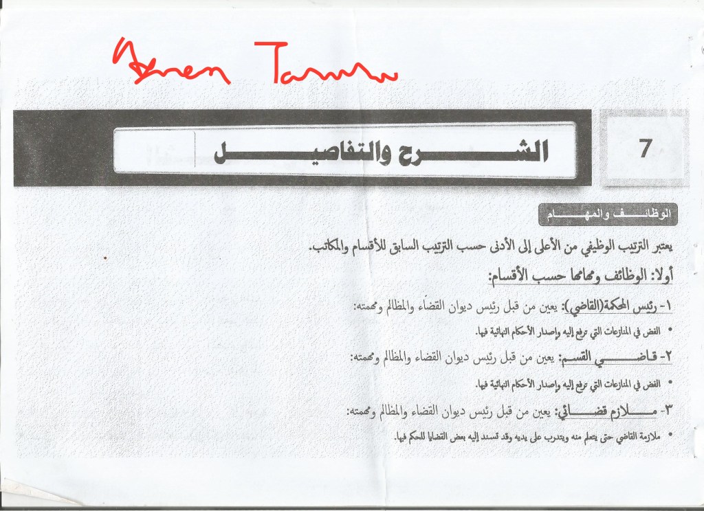 3. Judiciary assistant, appointed by the head of the Diwan al-Qada wa al-Madhalim and his task is to accompany the judge so as to learn from him and be trained at his hands and some of the cases may be referred to him to rule on.