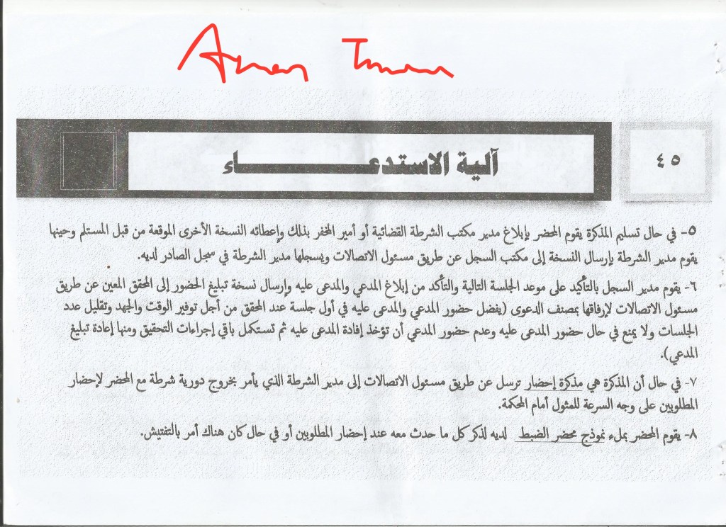 4. The director of police sends the court usher with the notice to hand them to the relevant individuals and in the event that the court usher does not find the summoned or whoso represents him in accordance with the list that specifies who has priority of receipt of notice of summons if the summoned is not present, he informs the registry of that two days before the appointment of the session, in order to renew the notice of summons to specify a new appointment, or the court usher hands the notification to the amir of the area of to the amir of the Hisba and takes a signature from them of receipt on the other copy in order to return it to the registry office through the police director.