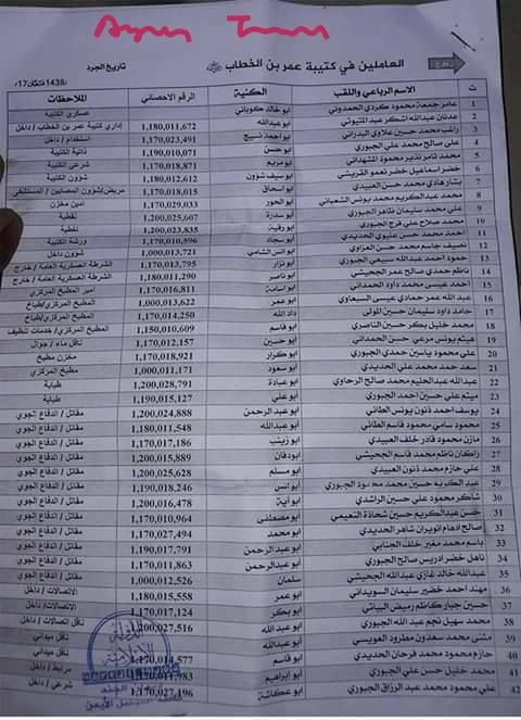 [Comment: Note that in the above translation, any parenthetical insertions in square brackets are my own. These documents provide a useful overview of a battalion of the Islamic State’s forces in the west Mosul, appearing to date from May 2017 not long before the conclusion of the battle of Mosul. Personnel in the battalion can take on a variety of functions: some function as kitchen staff, others take on a Shari’i function, but the majority are sentinels (called ‘murabiteen’ in Arabic: i.e. they man the front-lines). It is also worth noting the survey number, a system of marking formal members who have pledged allegiance to the Islamic State, as opposed to the ‘munasir’ (‘supporter’) who is of a different category. The survey number generally takes the form of A,BCD,EFG,HIJ. Normally, A is 1, B and C are treated as one number ranging from 00 to 20, D and E are both 0, and the remaining digits appear to be variable. For example: