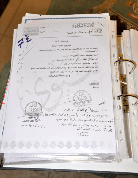 [In handwriting]: The ruined sum that was found in the pocket of the brother Laith Yaseen (known as Omar al-Musawwir and killed after aircraft bombed his car) was replaced, and a sum of $2600 was paid to the two creditors according to the attached pledge.