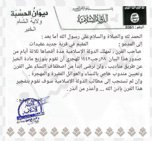 To the individual called [redacted], living in the village of Jadid Aqeedat and owner of the oven: the Islamic State gives you a deadline of three days at most from the issuing of this statement 28 Rajab 1442 AH to distribute bread through agents. And we will never be content with the queue of women at the bakery and appointment of an agent particular to the women and the poor and displaced families.