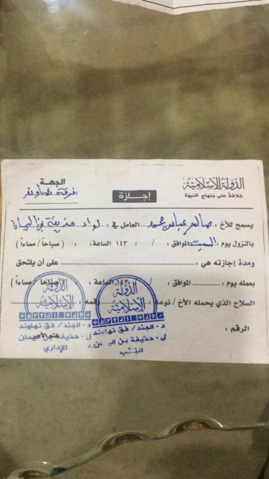The brother Taher Abbas Muhammad who works in the Hudhaifa bin al-Yaman brigade is permitted to leave on Saturday corresponding to / / 143[…] at time …. (morning/evening).