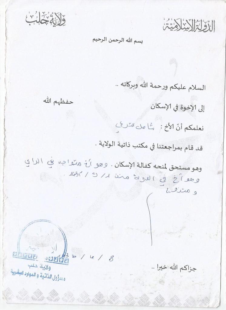 We inform you that the brother Shamil al-Tadafi [?], came to us in the wilaya’s personnel office, and he is entitled to be given settlement sponsorship [i.e. rent subsidy etc.]: [in handwriting] and he is a brother present in al-Ra’i and he has been a brother in the Dawla [i.e. member of the Islamic State] since 1 Ramadan 1435 AH [?], and he is married.