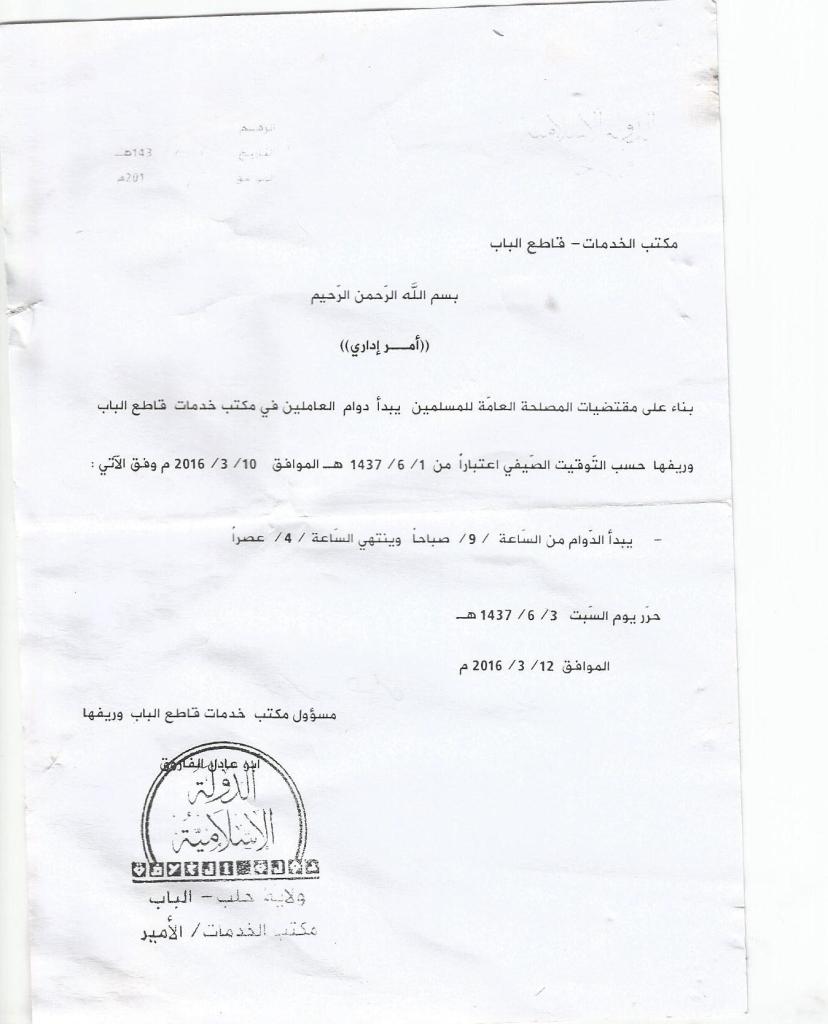 In accordance with the requirements of the general interest of the Muslims, workers’ office hours in the services office of sector of al-Bab and its countryside begin according to summertime reckoning from 1 Jumada al-Thani 1437 AH corresponding to 10 March 2016 CE, per the following: