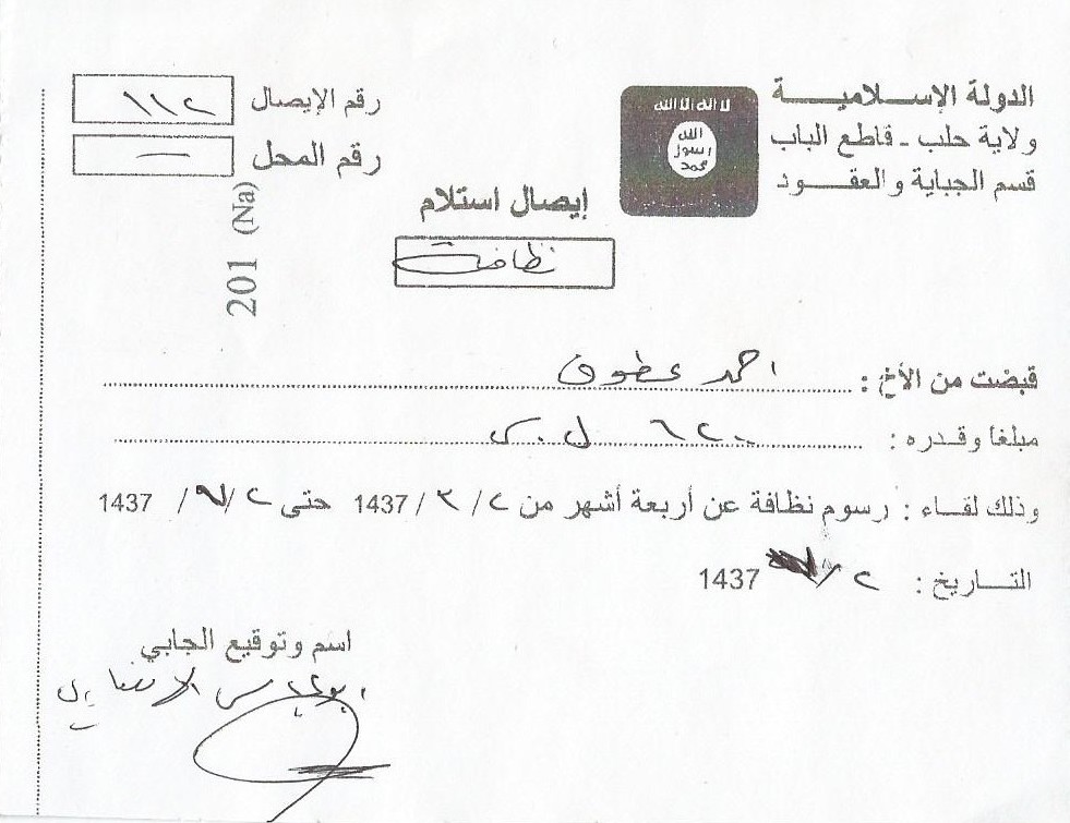 I have received from the brother Ahmad Atouf a sum of 6200 Syrian pounds for the purpose of cleaning fees for four months from 2 Rabi’ al-Awal 1437 AH until 2 Rajab 1437 AH.