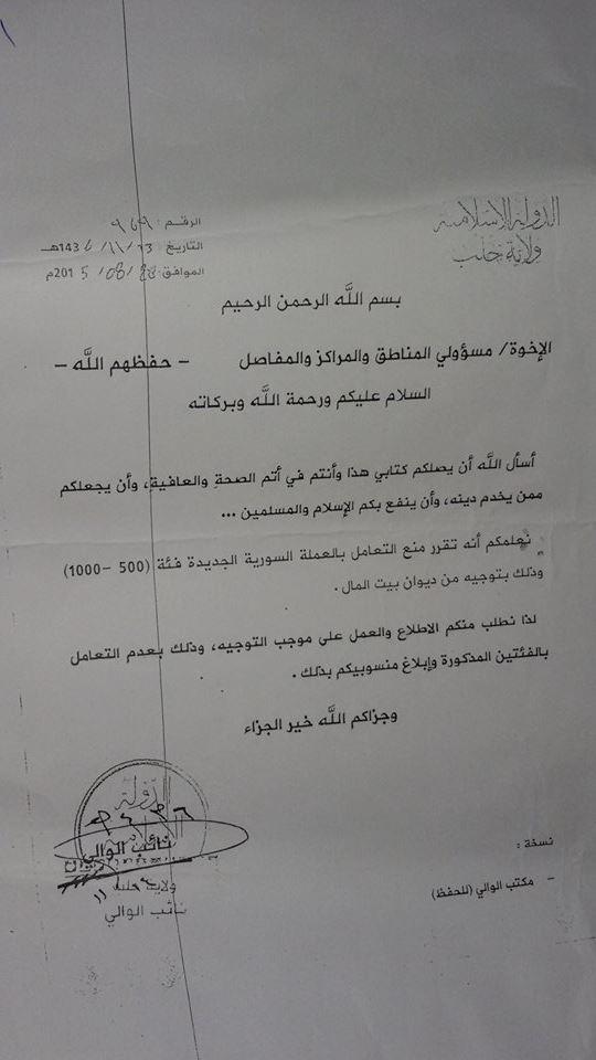 We inform you it has been decided to prohibit dealing in the new Syrian currency (500-1000 notes) per directive of the Diwan Bayt al-Mal.