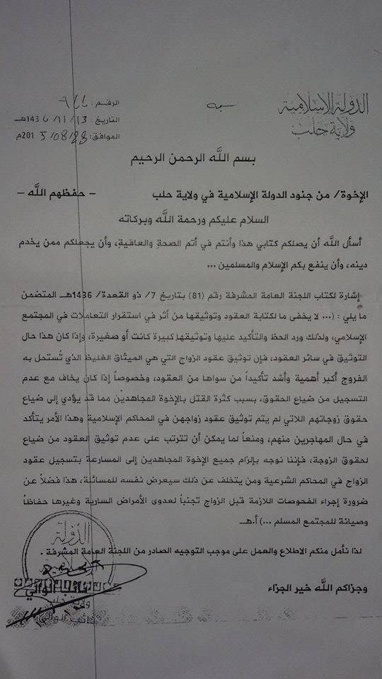 Taking note of letter 81 of the General Supervisory Committee dated 7 Dhu al-Q’ida 1436 AH that contains the following: “..The impact that the writing and notarisation of contracts has on stability of transactions in the Muslim society is no secret. Thus these contract and their notarisation- regardless of whether they are small or big- have been encouraged and emphasised. If this is the case for notarisation for the rest of the contracts, then notarisation of marriage contracts, which are the thick covenant through which the private parts become permissible, is of greater importance and emphasis than other contracts, especially if there is fear of loss of rights with lack of registration because of the large numbers of mujahideen brother who have been killed, which may lead to the loss of rights of their wives whose marriage contracts have not been notarised in the Islamic courts. This matter is confirmed in the case of the muhajirin among them. In order to prevent the possible consequences of lack of notarisation of contracts in terms of loss of rights of the wife, we direct for all the mujahidin brothers to be obliged to hurry to register marriage contracts in the Shari’i courts, and the one who refrains from doing will expose himself to accountability. This is so in addition to conducting the necessary tests before marriage to avoid transmission of contagious diseases and other diseases, in order to protect and maintain the Muslim society…”