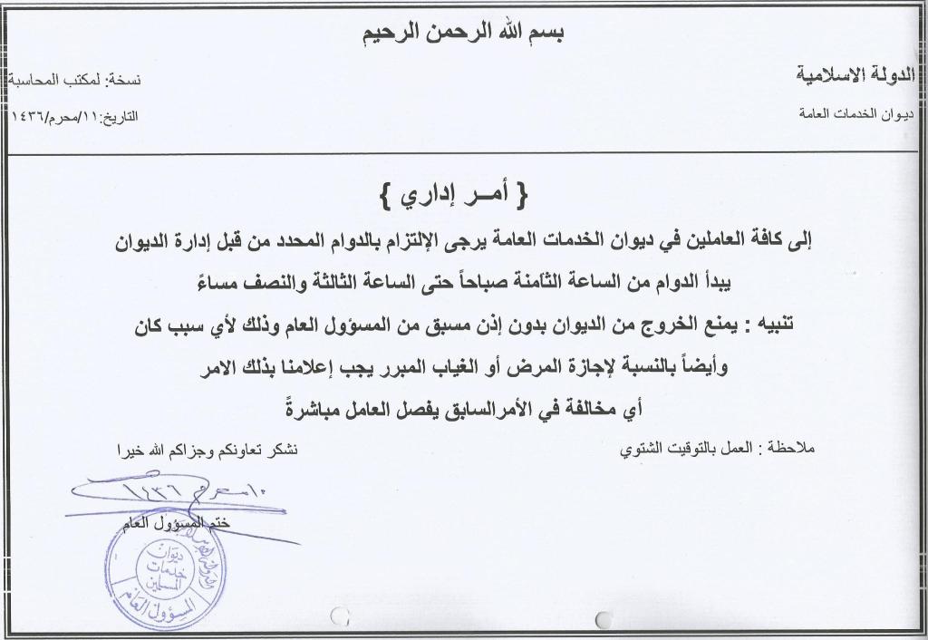 To all those working in the Diwan al-Khidamat al-‘Aama, please comply with the work hours specified by the Diwan’s administration. Work starts at 8 a.m. and ends at 3:30 p.m.