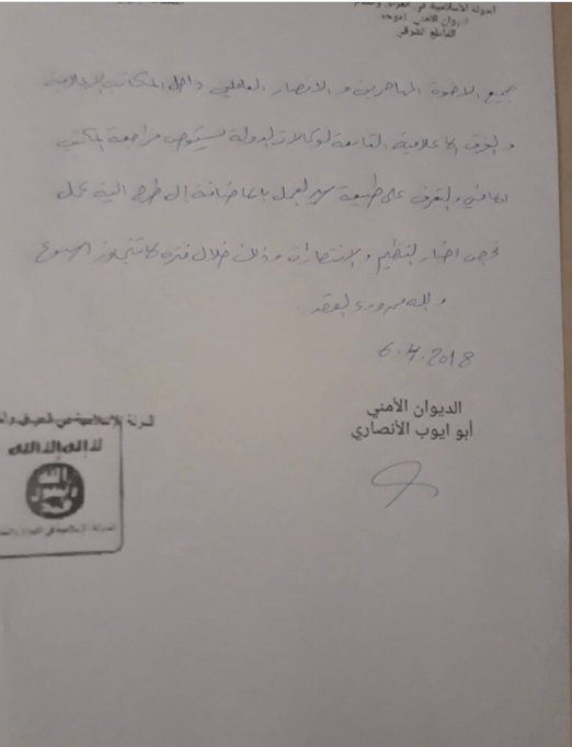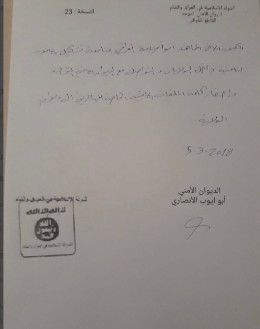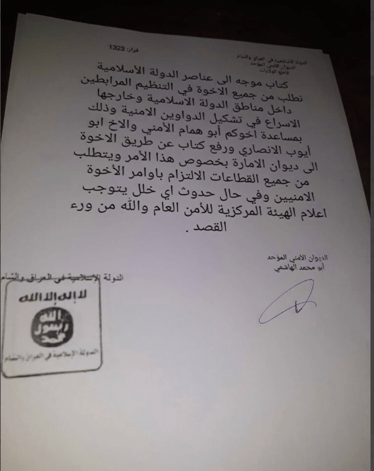 Letter directed to the personnel of the Islamic State. We ask all the brothers in the organisation on ribat inside and outside the areas of the Islamic State to hurry to form the covert [/security?] Diwans with the help of your brother Abu Humam al-Amni and the brother Abu Ayub al-Ansari. Please also refer a letter via the brothers to the Diwan of Amirship regarding this matter. All the sectors are requested to comply with the orders of the amni brothers, and in the event of there being any fault, the central committee for public security is to be informed, and God is the One behind the intention.