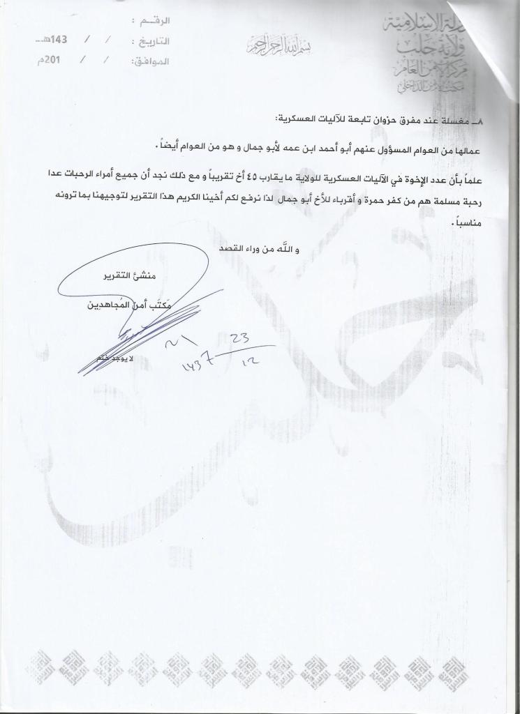 Note that the number of brothers in the military vehicles sector of the wilaya is around 45 brothers. Despite this, we find that all the amirs of the departments, with the exception of the Muslima department, are from Kafr Hamra and relatives of the brother Abu Jamal. Therefore, we send this report t you, dear brother, so you can direct us as you consider appropriate.