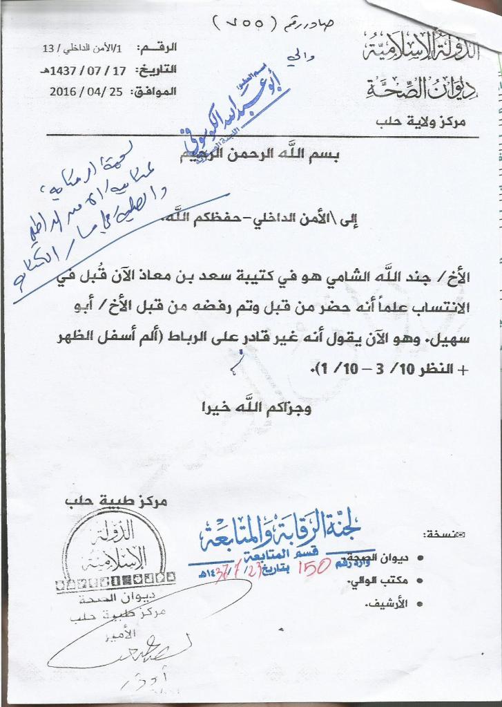 The brother Jundallah al-Shami is in the Sa’ad bin Mu’adh Battalion now. He was accepted for recruitment, though it should be noted that he came before and was rejected by the brother Abu Suhayl. Now he says that he is unable to perform ribat (pain in lower back and sight: 1/10-3/10).