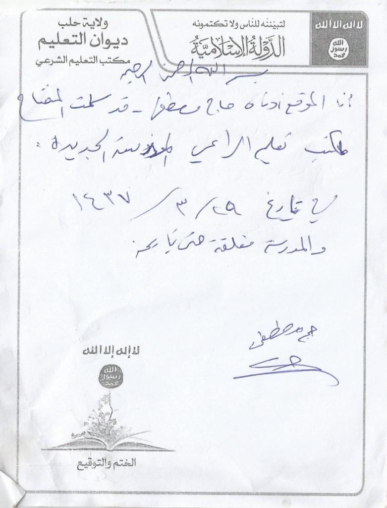 I- the signatory below- Hajj Mustafa have handed over the key to the al-Ra’i Education Office- the new school on date 29 Rabi’ al-Awal 1437 AH [10 January 2016 CE]. And the school has been closed until this date.