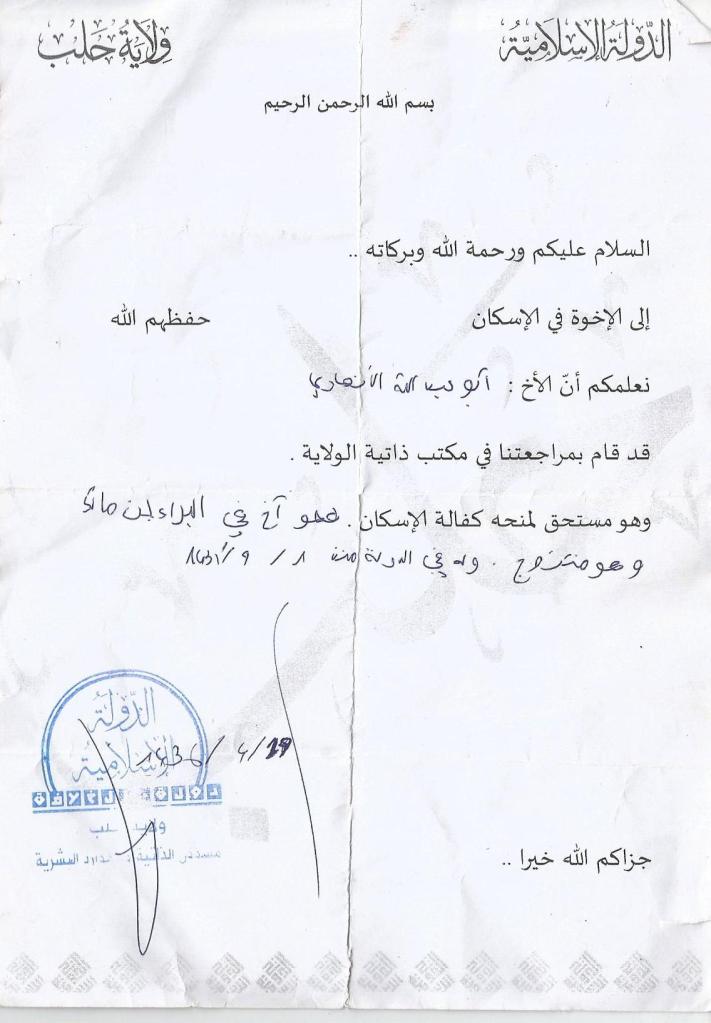 We inform you that the brother Abu Abdullah al-Ansari saw us in the wilaya’s personnel data office, and he is entitled to being granted the residency sponsorship: he is a brother in al-Bara’ bin Malik [battalion?], is married and has been a member of the Dawla since 1 Ramadan 1435 AH.
