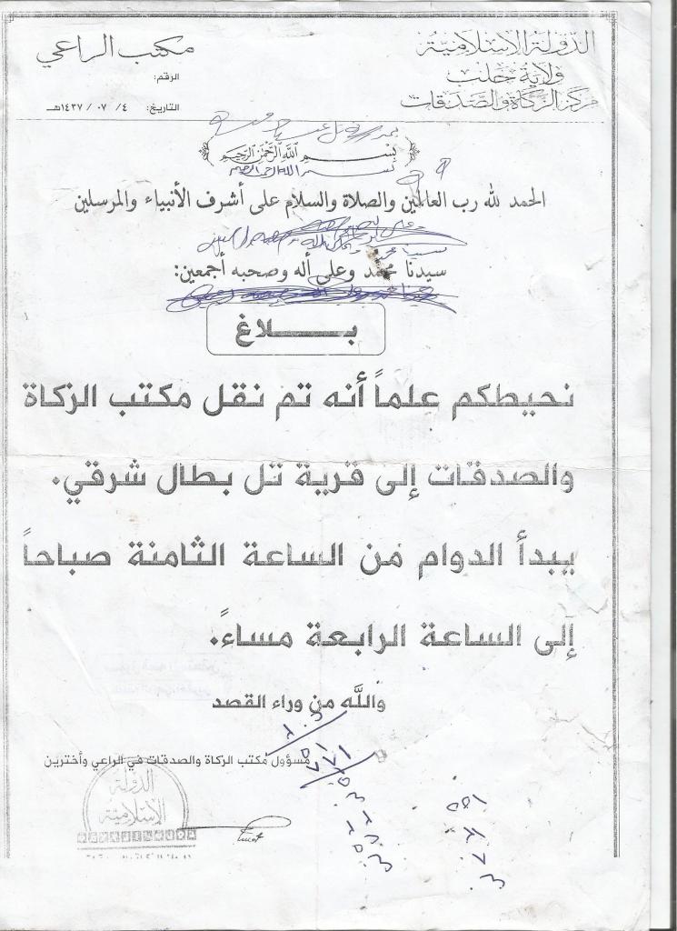 We inform you that the zakat and sadaqat office has been transferred to the village of Tel Batal Sharqi. Office hours last from 8 a.m. to 4 p.m.
