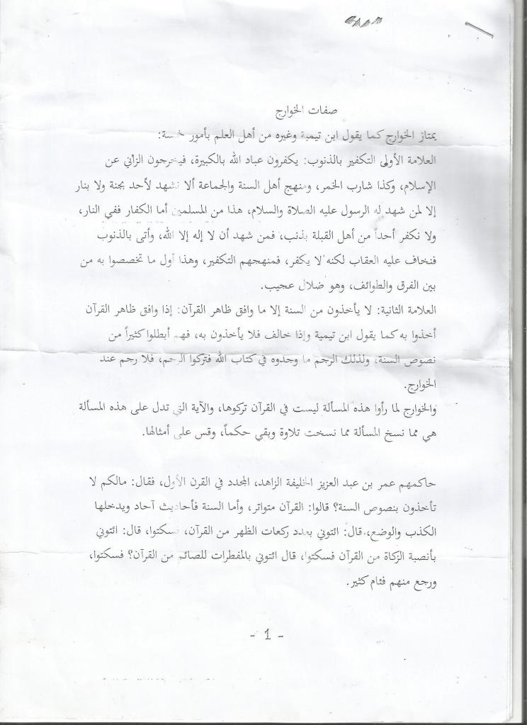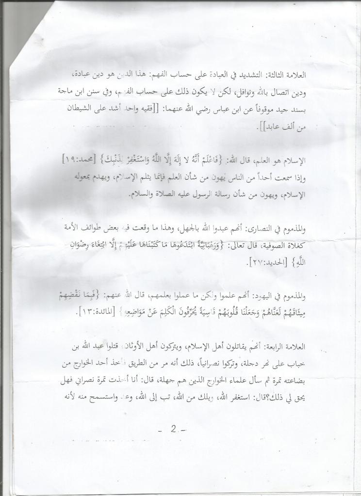 The second sign: they only adopt from the Sunna what concords with the outward meaning of the Qur’an. If the outward meaning of the Qur’an agrees, they adopt it, as Ibn Taymiyya says, and if it contravenes, they do not adopt it. As such, they have deemed many of the Sunna’s precepts invalid. For example, since they have not found stoning to be mentioned in God’s Book, they have abandoned stoning, so stoning is not a practice for the Khawarij. When the Khawarij saw this issue is not in the Qur’an, they abandoned it, and the verse that provides evidence for this issue is part of the issue of abrogation in that it has been abrogated in recitation and remained as a ruling, and the same reasoning applies to the likes of it.