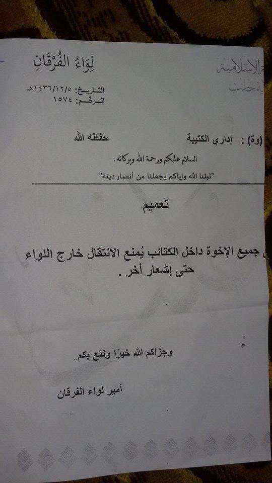 In the event of any reinforcements sent by the battalion to another battalion inside the brigade or outside it, it is absolutely forbidden to receive the brothers after their return and permit them to return to the battalion, except with a document from the brigade’s administration or the battalion in which the brother provided auxiliary support, making clear the end of the period of his ribat and that he has returned by official permission.