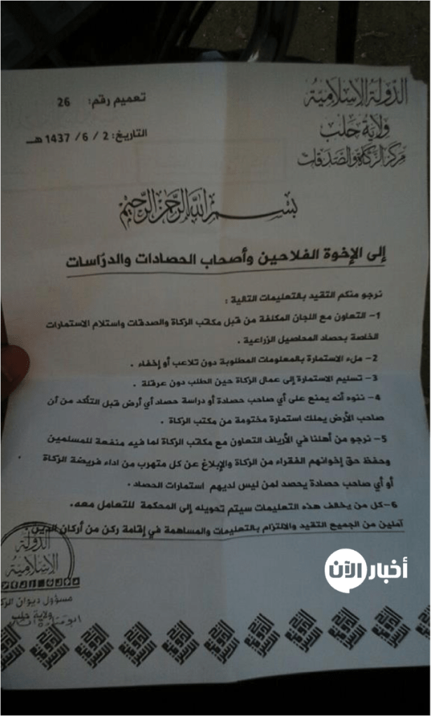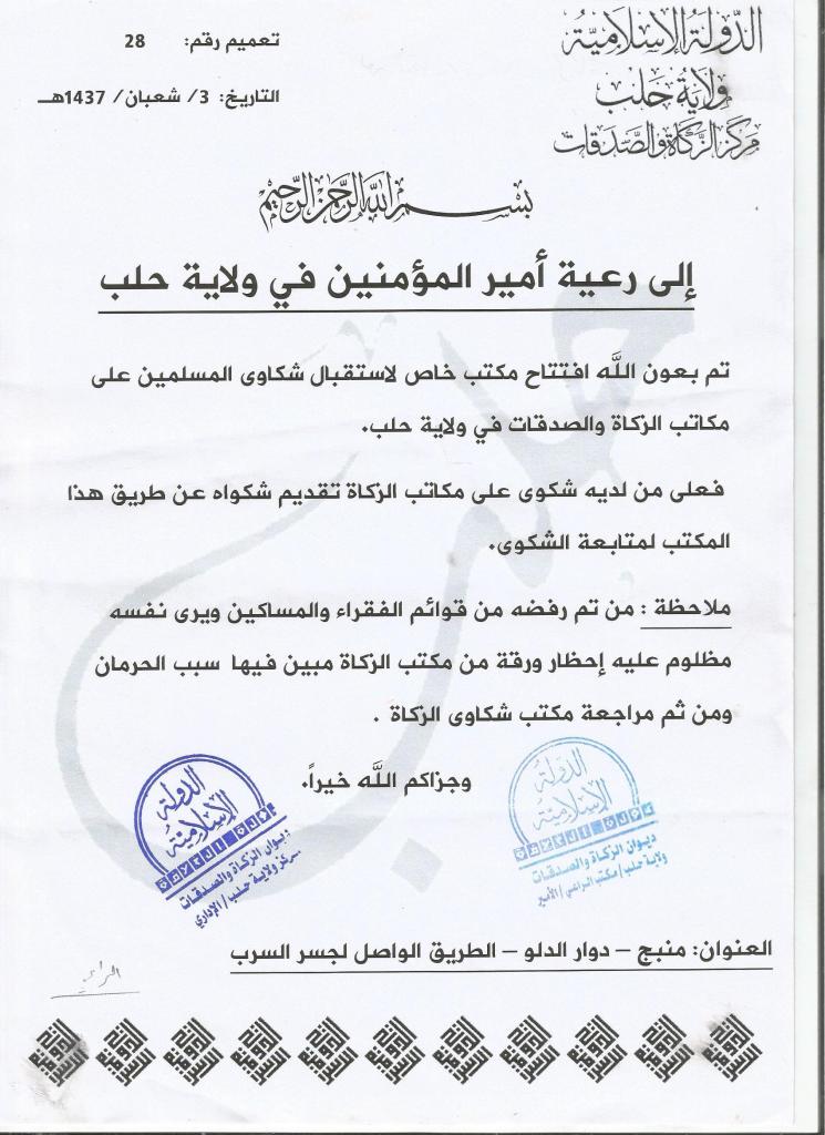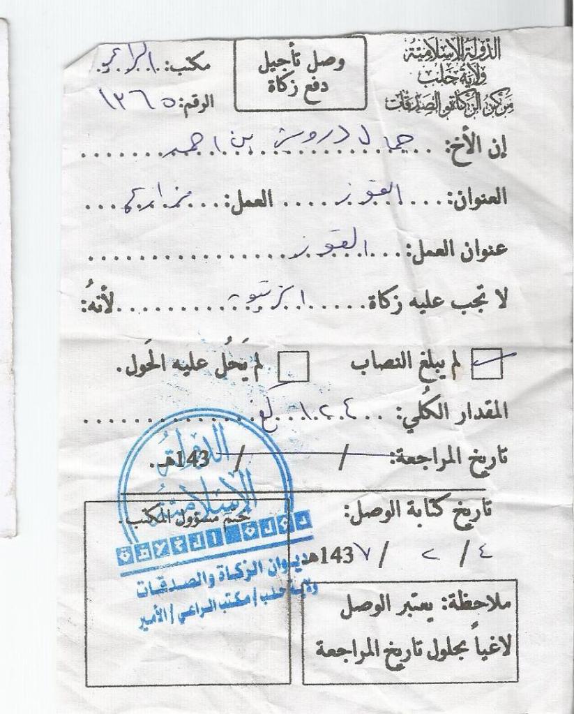 Islamic State Diwan al-Zakat wa al-Sadaqat Wilayat Halab/Jarabulus Office/Amir