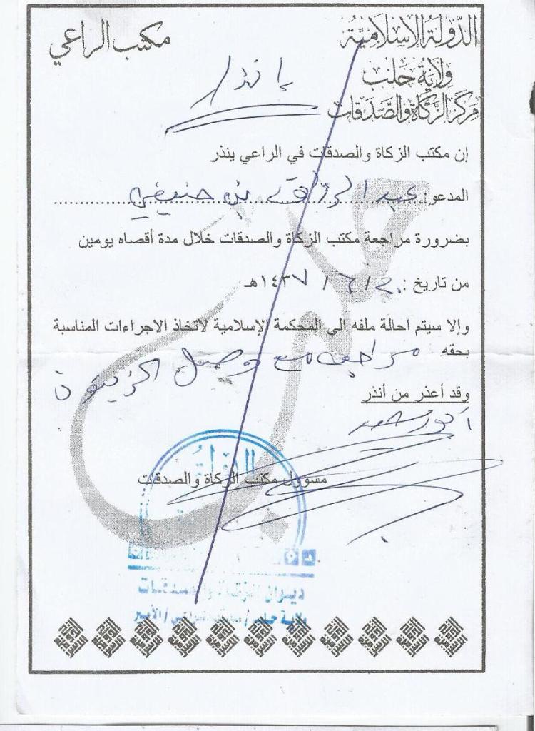 The Zakat and Sadaqat office in al-Ra’i warns the one called Abd al-Razzaq bin Hunaifi that he must go see the Zakat and Sadaqat office within two days from date 20 Jumada al-Thani 1437 AH. Otherwise, his file will be referred to the Islamic court to take appropriate measures against him.