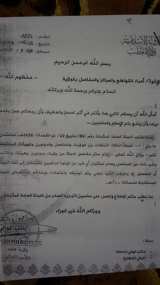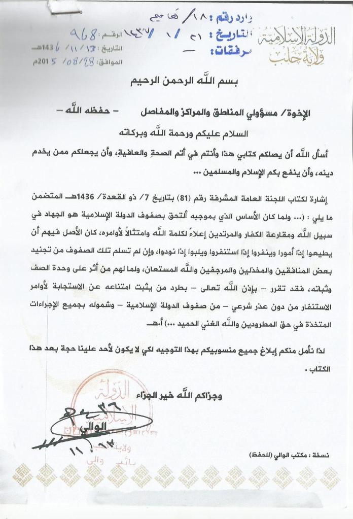 Note the letter of the General Supervisory Committee no. 81 on date 7 Dhu al-Q’ida 1436 AH, which contains the following: “…As the basis on which one has joined the ranks of the Islamic State is jihad in God’s path and fighting the disbelievers and apostates in order to make supreme the word of God and obey His commands, the principle among them [those who have joined] is that they should obey when commanded, mobilise when ordered to do so, and heed when called. If those ranks have been not safe from the recruitment of some of the hypocrites and people who cause others to abandon and people who spread false rumours (and God is the One whose help is to be sought), and the impact they have on the unity of rank and its steadfastness, then it is decided to expel from the ranks of the Islamic State- by the permission of God Almighty- those whose refusal to answer orders for mobilisation without a Shari’i excuse is established, and all the measures taken against those who have been expelled will apply to them. And God is the Self-Sufficient and One Worthy of Praise…”