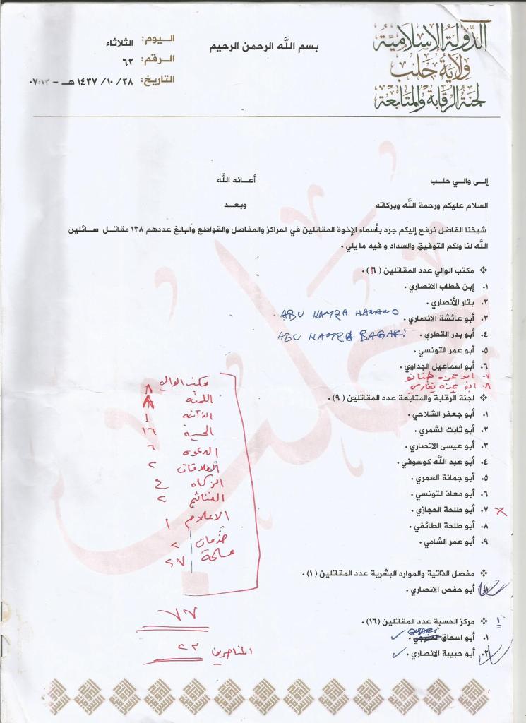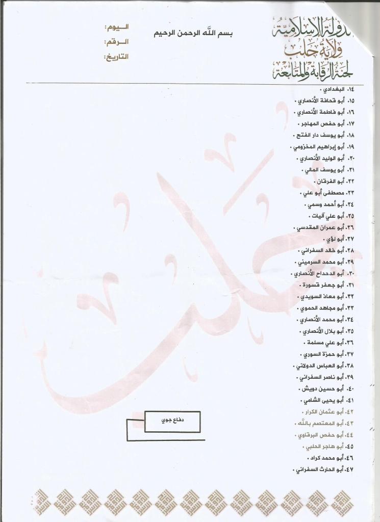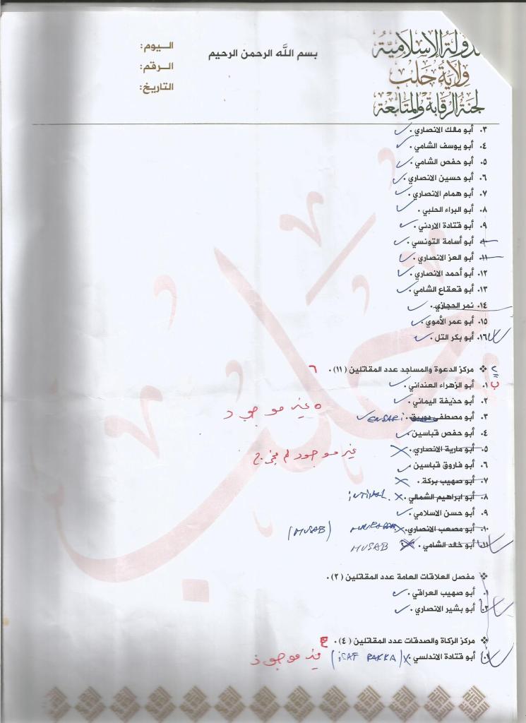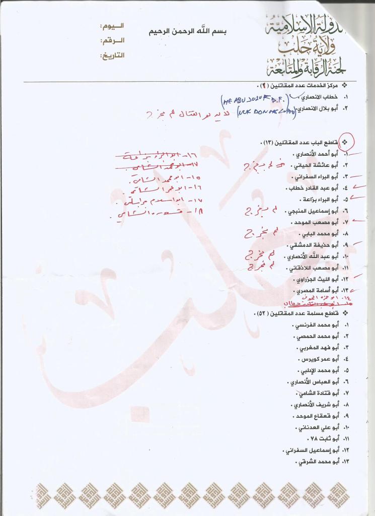 1. Abu Ahmad al-Ansari 2. Abu A’isha al-Hayani [in handwriting: he has not come out] 3. Abu al-Bara’ al-Safrani 4. Abu Abd al-Qadir Khattab 5. Abu al-Bara’ Baza’a 6. Abu Isma’il al-Manbiji [in handwriting: he has not come out] 7. Abu Mus’ab al-Muwahhid [in handwriting: he has not come out] 8. Abu Muhammad al-Babi [in handwriting: he has not come out] 9. Abu Hudhayfa al-Dimashqi 10. Abu Abdullah al-Ansari [in handwriting: he has not come out] 11. Abu Mus’ab al-Ladhaqani [in handwriting: he has not come out] 12. Abu al-Layth al-Jazrawi 13. Abu Osama al-Masri [in handwriting]: 14. Abu Hamza al-Joufi 15. Abu Muhammad al-Shami 16. Abu Omar al-Shami 17. Abu Islam Jarabulusi 18. Qasura al-Shami