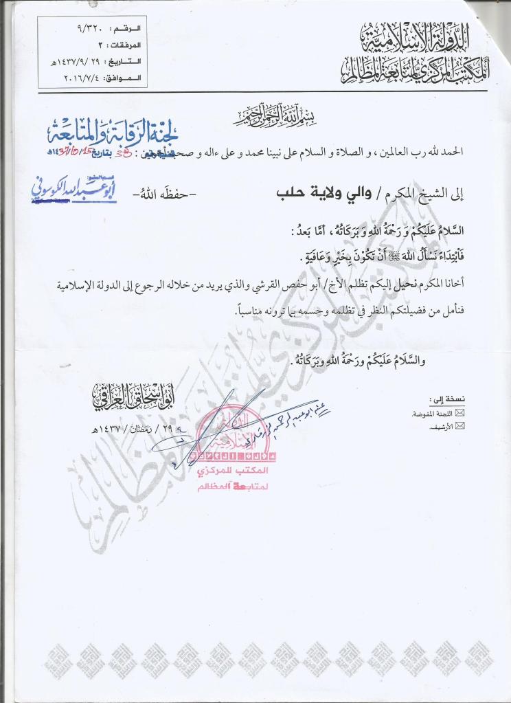 Dear brother, we refer to you the brother Abu Hafs al-Qurashi’s complaint, through which he wishes to return to the Islamic State, so we hope your eminence will review his complaint and decide on it as you deem appropriate.