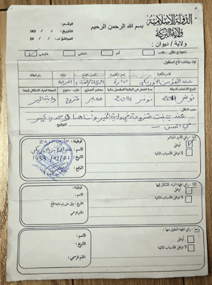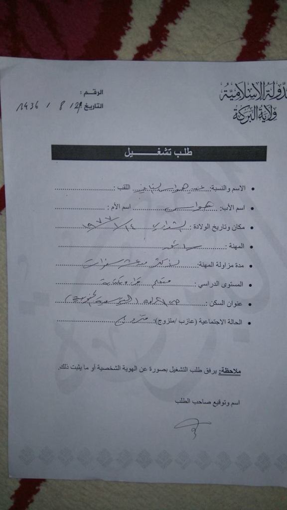 Name/Kunya: Abd al-Mu’min al-Uzbeki Work entrusted with: Administration Sector/area: Zakat/al-Shaddadi Wilaya: al-Baraka Card number: Date of joining the Dawla [Islamic State]: November 2014 Time of work in the wilaya/sector currently: November 2014 Muhajir/Ansari: Muhajir Single/married: Married Place to which there is the desire to be transferred: Wilayat al-Khayr
