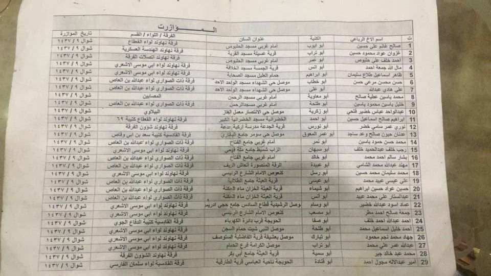 | 22 | Emad Aswad Abdullah Khudair | Abu Wisam | Mosul, al-Rashidiya, Qata’ al-Sadis, Hajji Idris mosque | Nahavand Division, Abu Musa al-Ash’ari Brigade | 9 Shawwal 1437 |